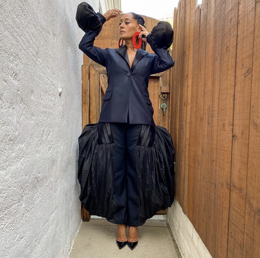 Tracee was wearing a two-piece tuxedo suit from designer Lowe from the Spring/Summer 2021 Collection