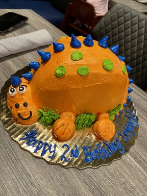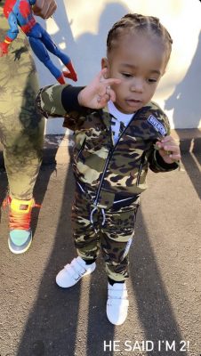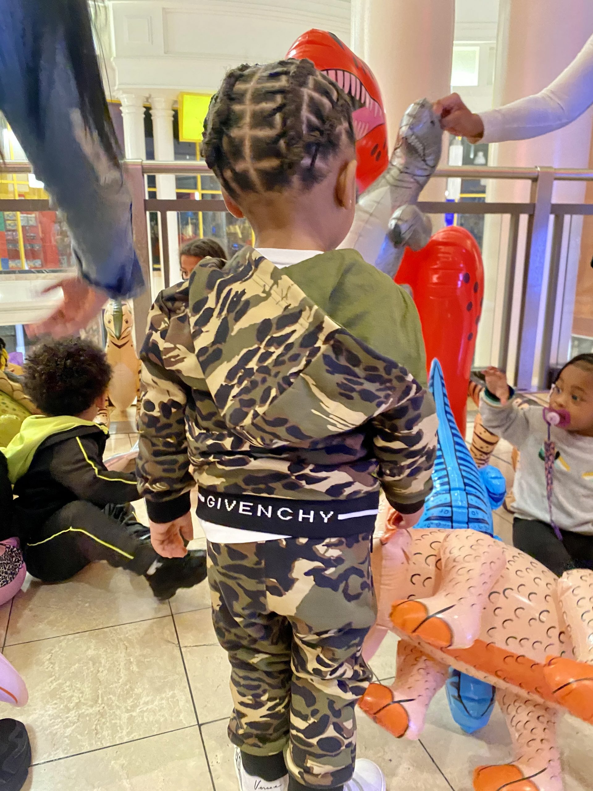 I bought him a small dinosaur cake to sing happy birthday with. Dinosaurs was the theme of the party this year. Legend loves cars and dinosaurs lol. At the restaurant he kept telling people walking by that he was two, it was the funniest thing! My daughter and I dressed in camouflage outfits to match the theme.