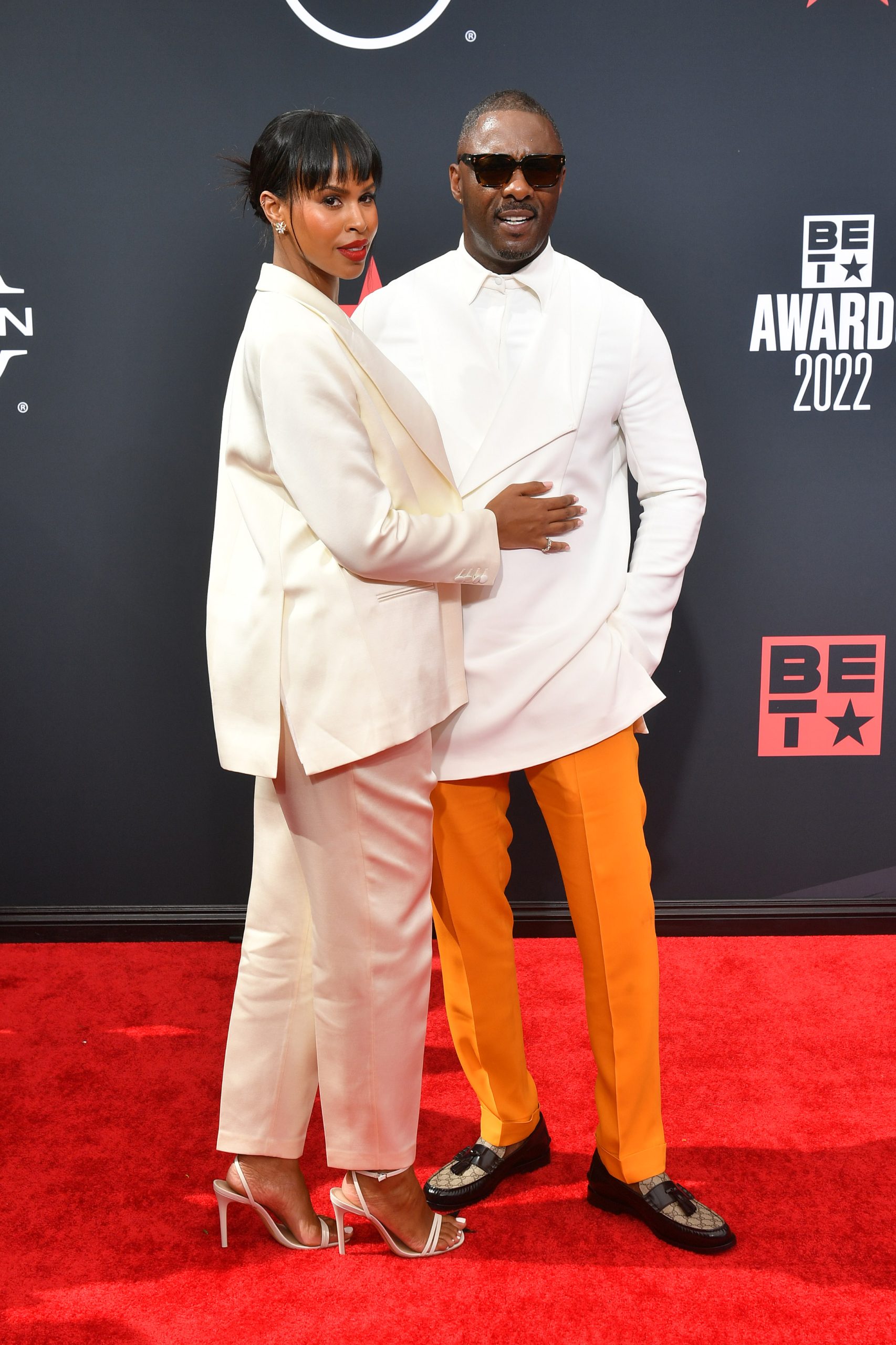 Yep you knew it was coming lol! Actor Idris Elba and his lovely wife Sabrina hit up the red carpet at the BET Awards today in Los Angeles looking suave and debonair. He wore a white tailored shirt and yellow dress slacks with black shades for the occasion with loafers. Loved his summer look that was great on his skintone. More pictures inside….