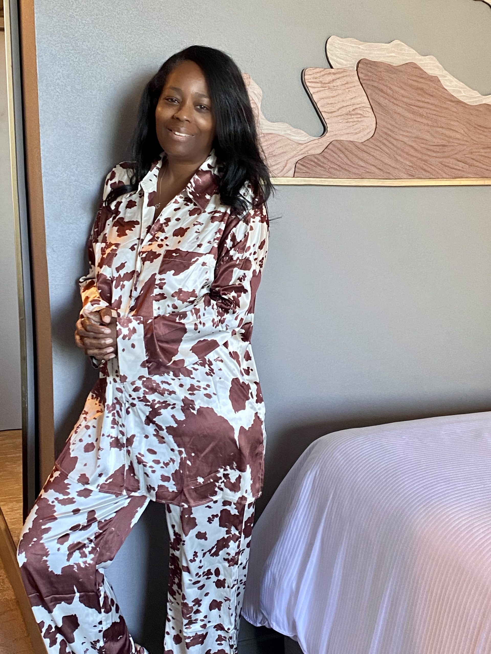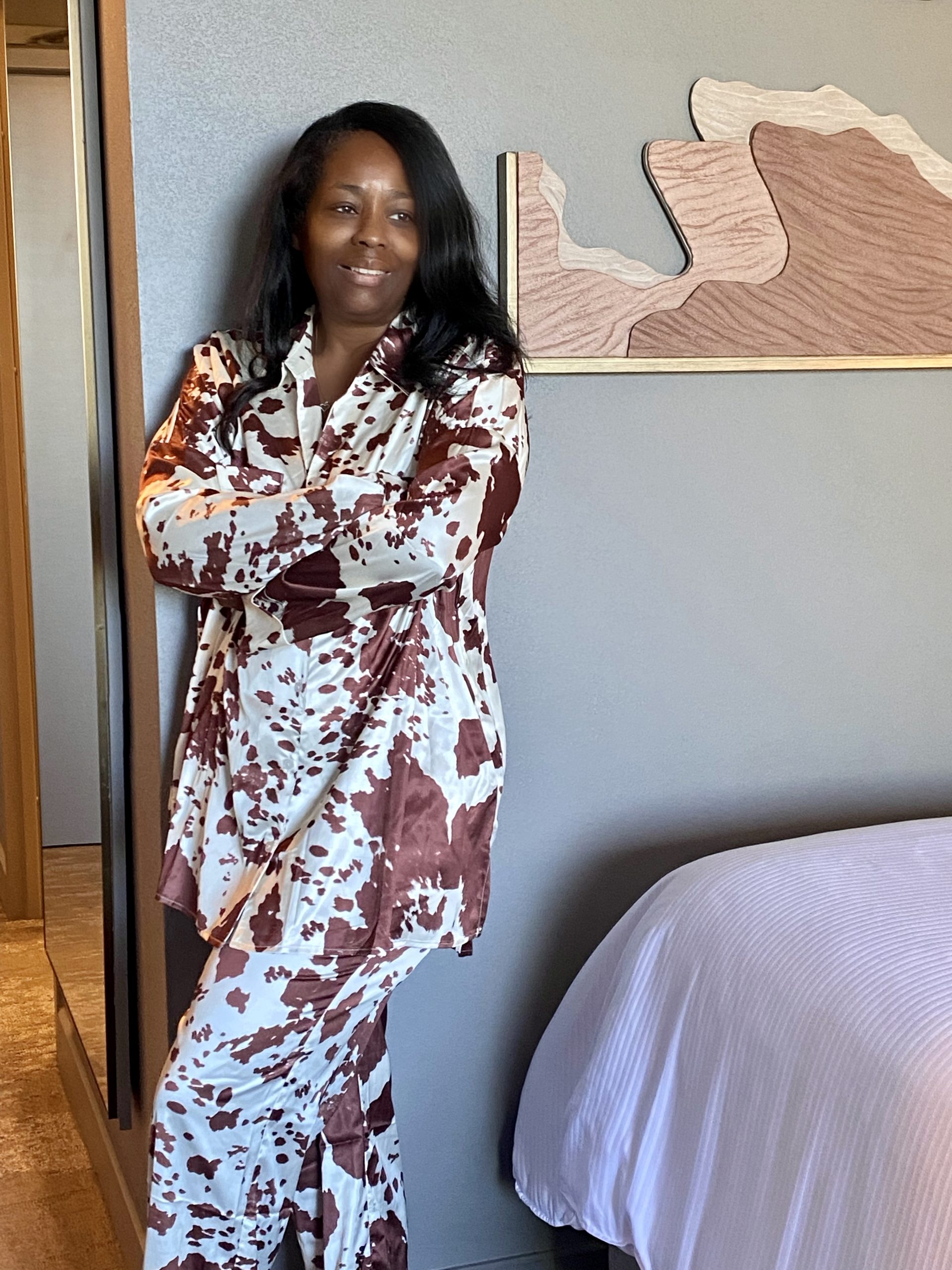 I’m such a theme dresses and I can’t help it lol! I am on a press trip here in Phoenix, Arizona for my first-ever black rodeo! I quickly went to searching for some fun western looks when my friends over at Show Me Your Mumu had just got in some brand new cowgirl outfits! They had these satin pjs in cowhide print that went perfect for my trip and I quickly ordered!