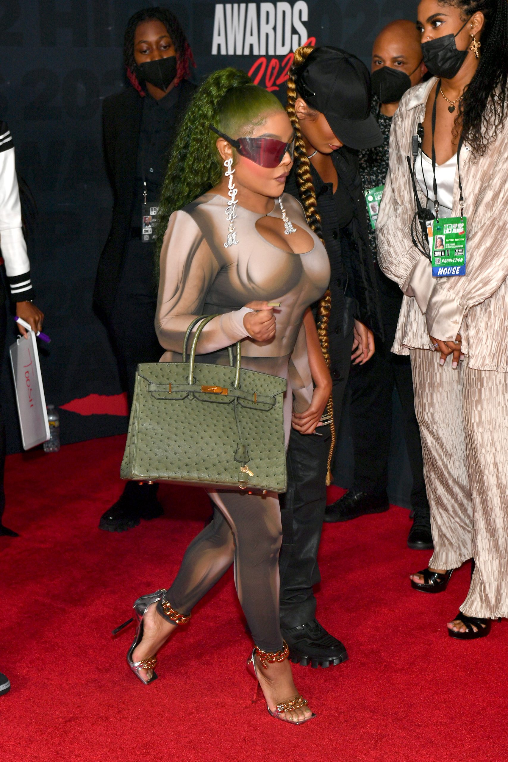 Rapper Lil Kim made her way to the BET Hip Hop Awards red carpet here in Atlanta at the Cobb Performance Art Center on Friday evening. She did a performance during the show with some of her medley of hits. Before the show she hit up the carpet rocking a green updo and rhinestoned “Lil Kim” earrings and shades with a skintight outfit and green handbag to match. Lots of performer that evening honored the legendary label LOUD Records. See more pictures and what designer she was wearing inside…