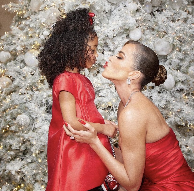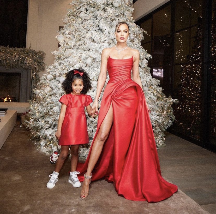 Reality Star Khloe Kardashian recently shared a few snaps with her instagram followers on Christmas day of her family before heading out to their annual family party. This year it was hosted by her oldest sister Kourtney Kardashian. Khloe gathered her two adorable kids, True & Baby Thompson for a few family photos with matching outfits in shades of red! She shares the children with ex Tristan Thompson.