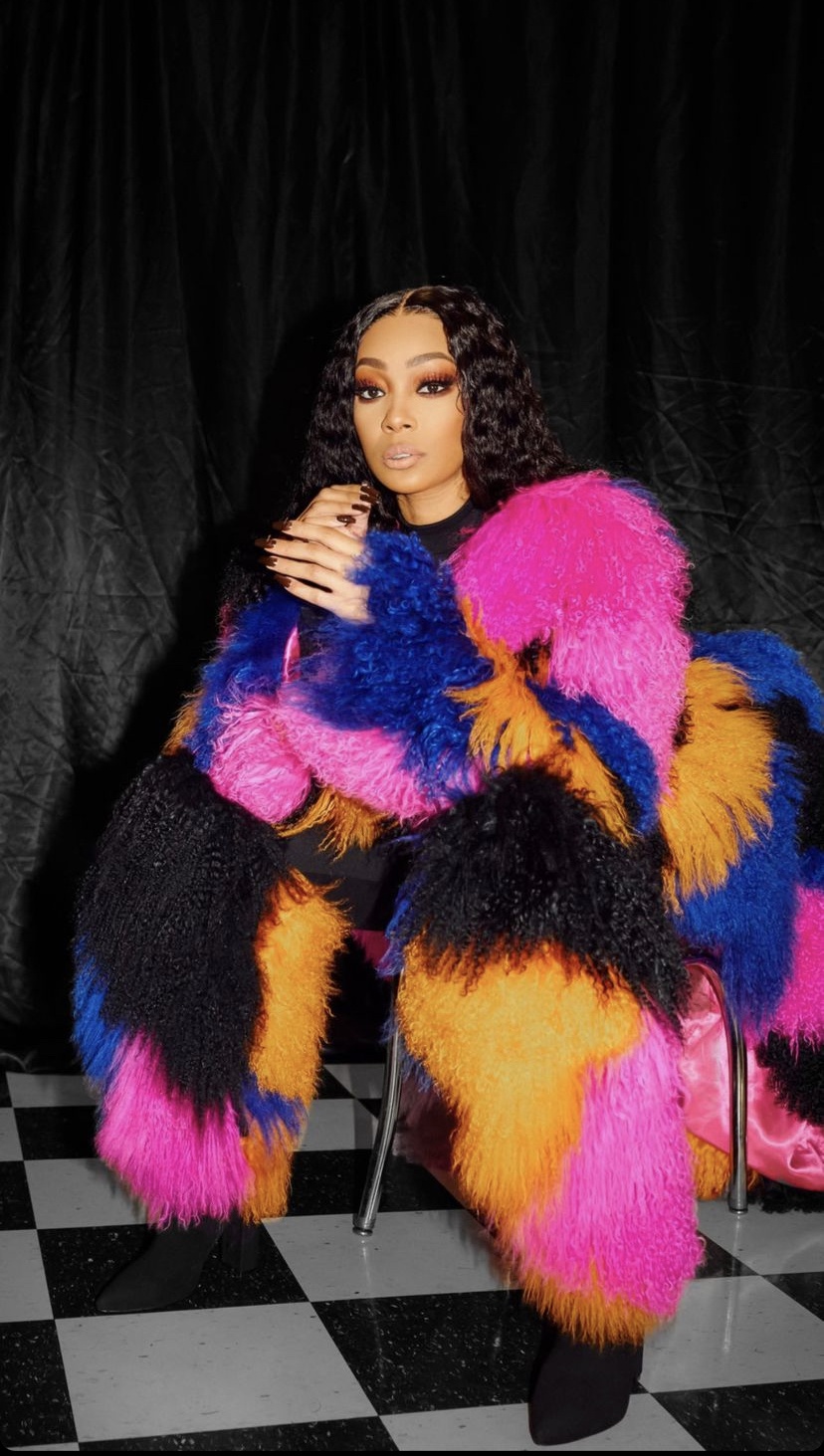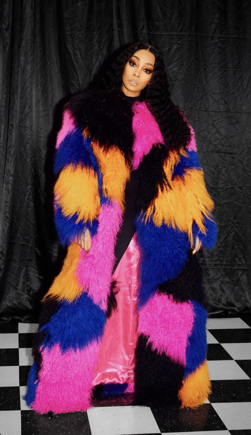 Monica was wearing custom colorful fur coat by Jennifer Le, pretty! Styled by No IG Jeremy
