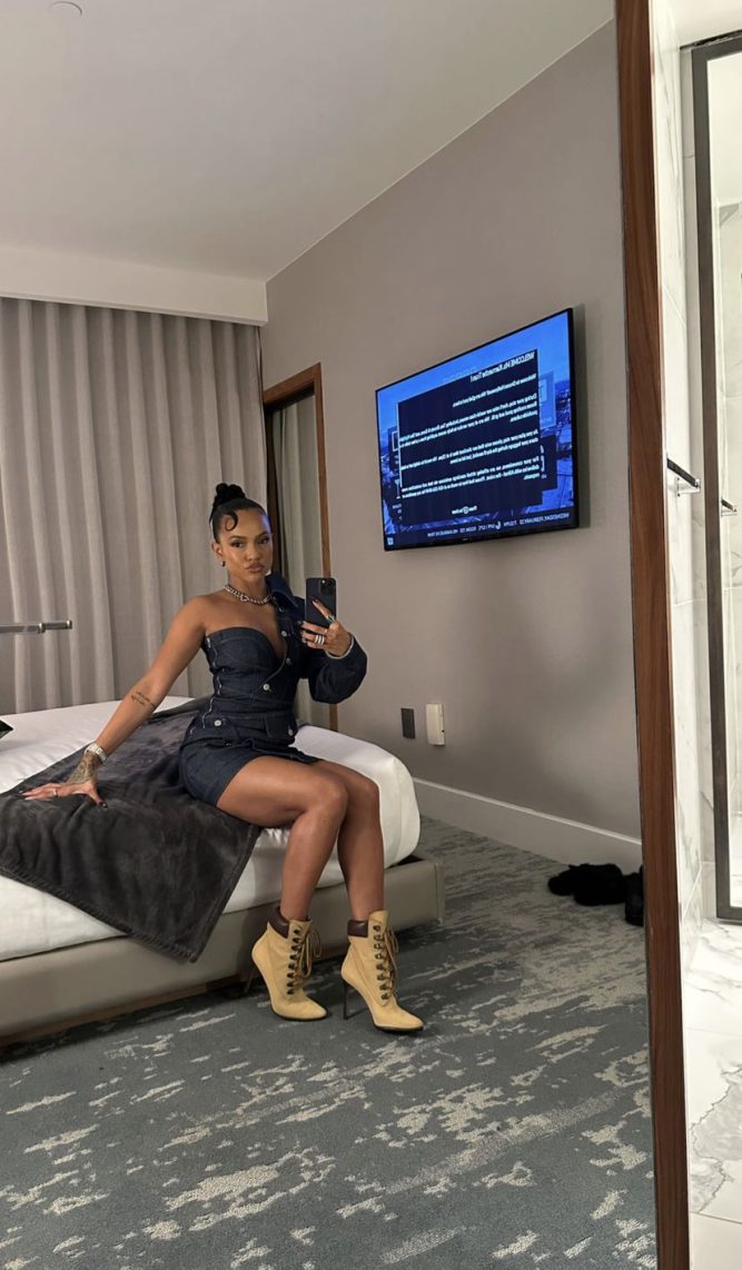 Karrueche was wearing a Lionne Clothing Brittany denim dress and stiletto boots, cute!