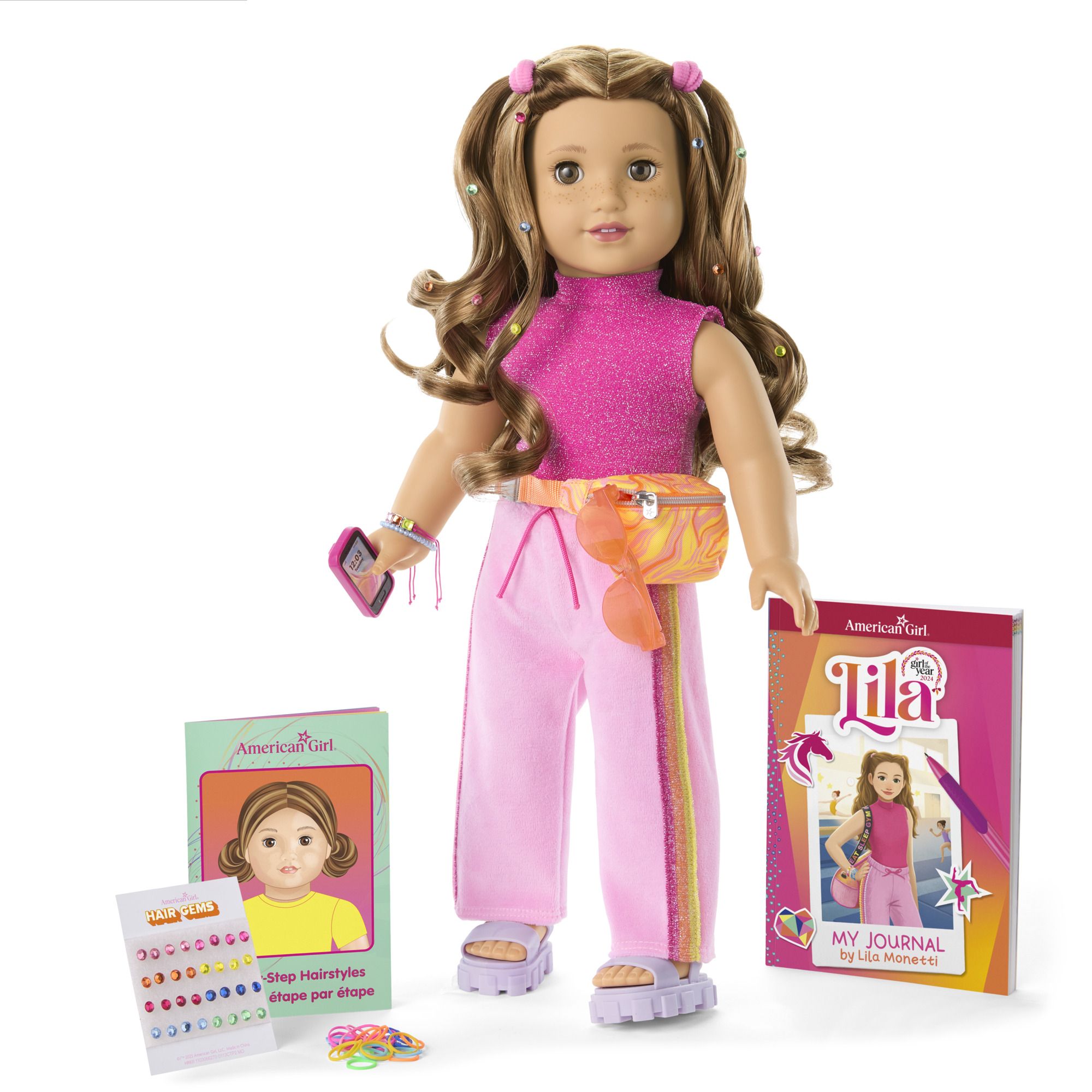 doll, featuring an exclusive look with amber eyes and caramel-colored hair styled in two half ponytails. Adorned in plenty of sparkle and shine, the Lila doll comes dressed in a glittery pink tank and track pants, plus colorful sandals, bracelets, and hairbands that perfectly match her accessories—like a cool crossbody bag, frameless sunglasses, and colorful hair accessories with styling tips.