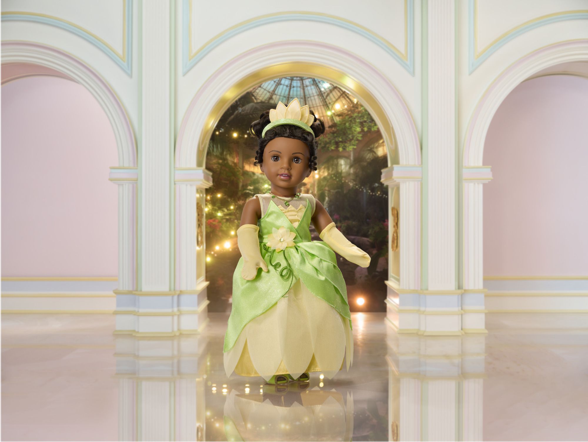 - The 18” Tiana doll has brown eyes and curly black hair styled in a high bun with face-framing tendrils and a glittery green headband with yellow organza and satin petals. Her green-and-yellow dress features an organza illusion neckline, satin petal-shaped bodice, layered green satin overskirt, yellow organza skirt with petal hem, and yellow satin underskirt. A yellow flower at the waist with a rhinestone center and embroidered vine details complete the look.