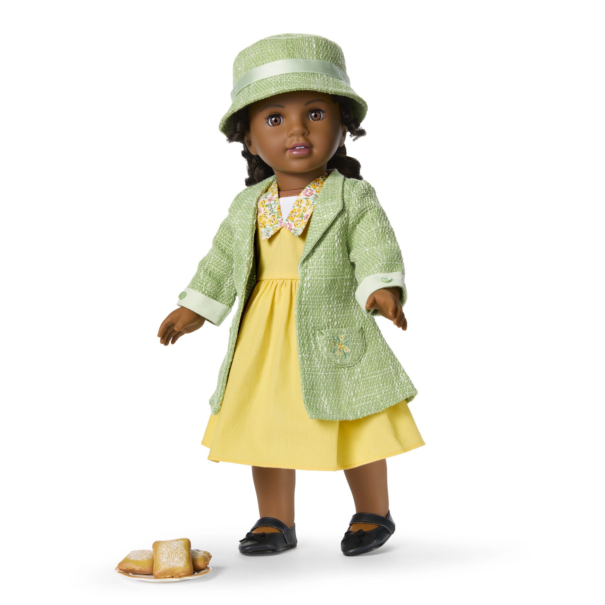 - This set includes a yellow cotton A-line dress with three-quarter sleeves, a floral printed collar and sleeve cuffs, and a white cotton yoke, a green boucle coat and matching hat with a grosgrain ribbon hat band, a pair of black Mary Jane shoes with bows at the toes, and three faux beignets and a plate.