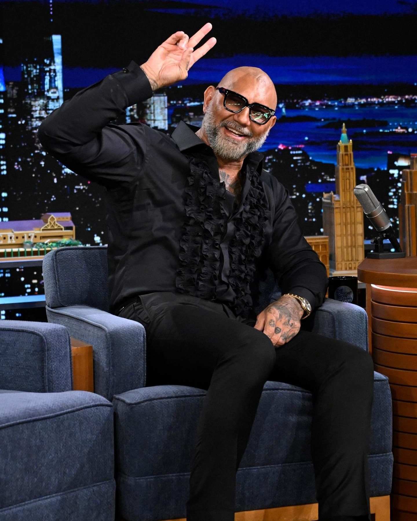 Actor Dave Bautista chatted with Jimmy Fallon about Chris Pratt and Millie Bobby Brown being the reason he adopted his dog Talulah, how he convinced Denis Villeneuve to give him a part in Blade Runner 2049 and working with Timothée Chalamet, Zendaya and more in Dune: Part Two. I remember meeting him in 2014 when he was in Guardians of the Galaxy, he was super sweet and really a huge guy but FINE!!!! See more inside and a video clip, I love me a well-dressed man lawd!