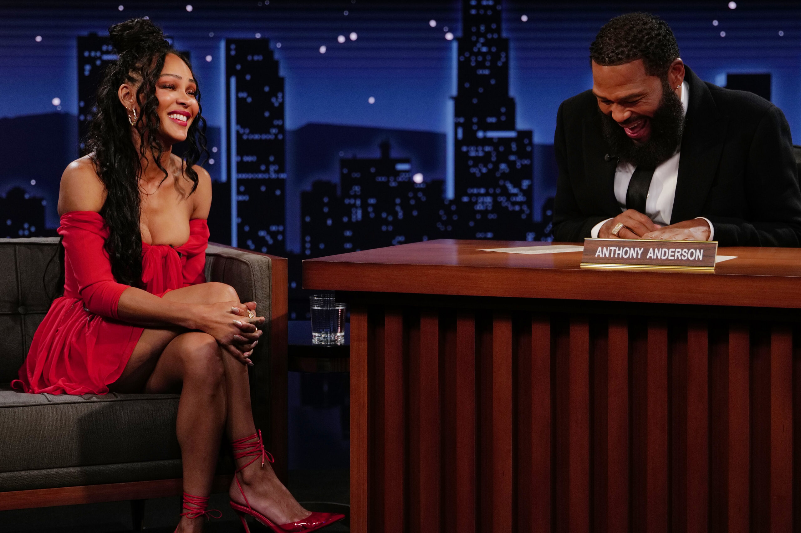 Actress Meagan Good sat down with Anthony Anderson (who’s filling in for Jimmy Kimmel) to talk about working with Shaq on an episode of “Cousin Skeeter,” run in with him at a gas station, lots of critter encounters growing up in Canyon Country, getting caught in the middle of a dog/coyote fight, and her new movie Tyler Perry’s Divorce in the Black.