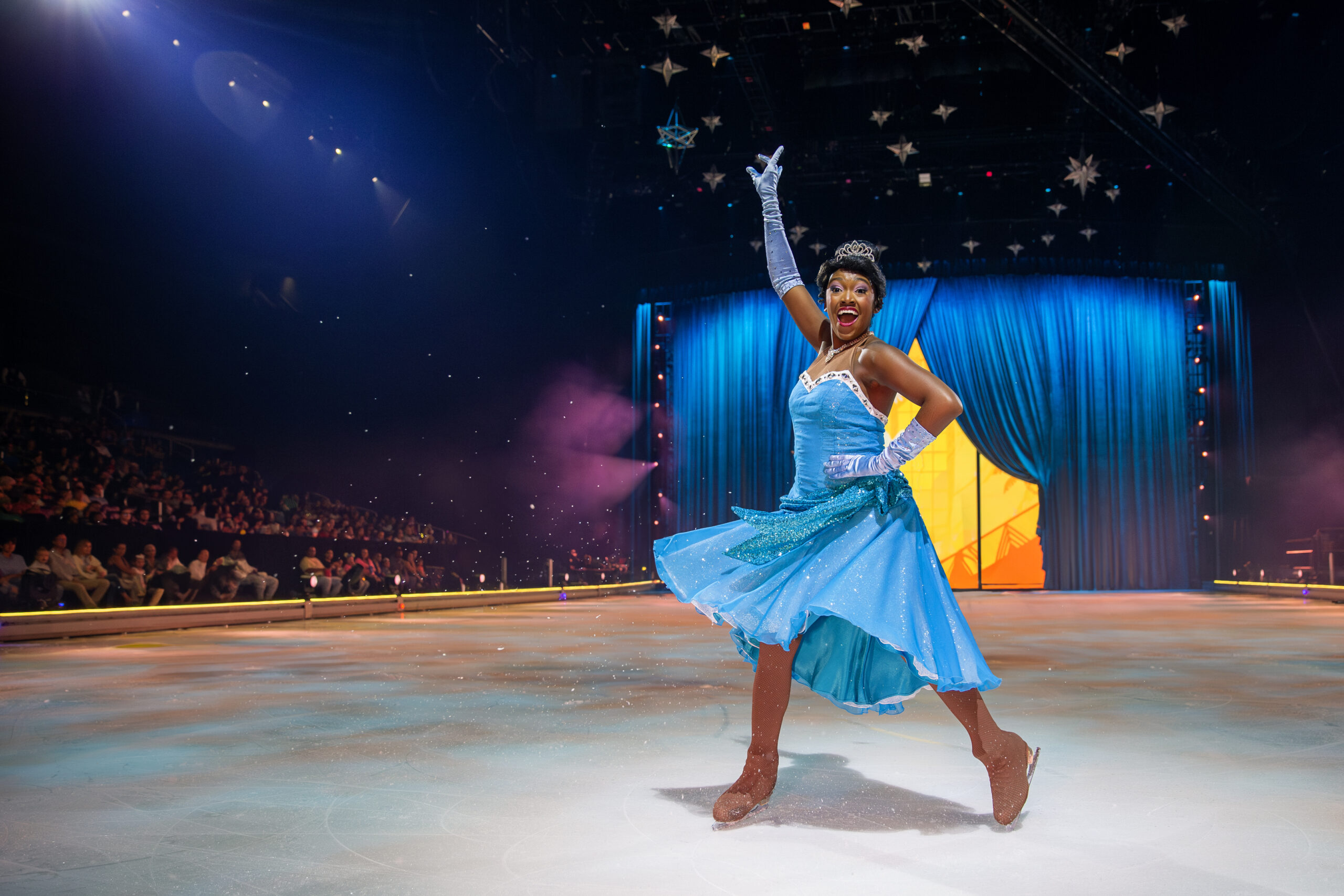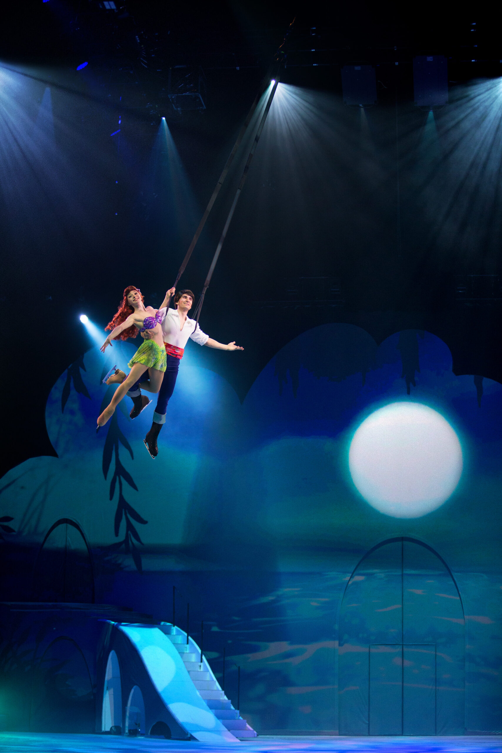 High-flying aerial stunts, including Ariel soaring above the ice and Rapunzel’s golden hair brought to life with dazzling silks.