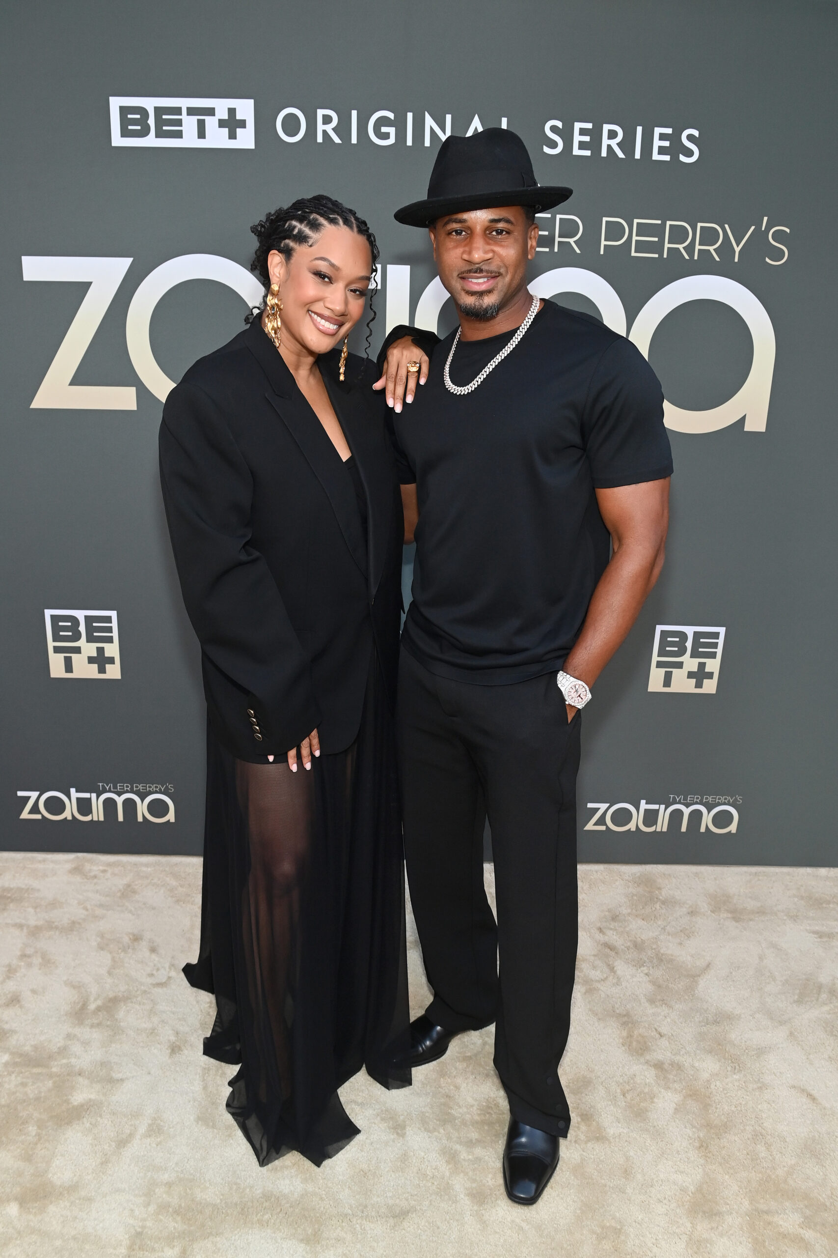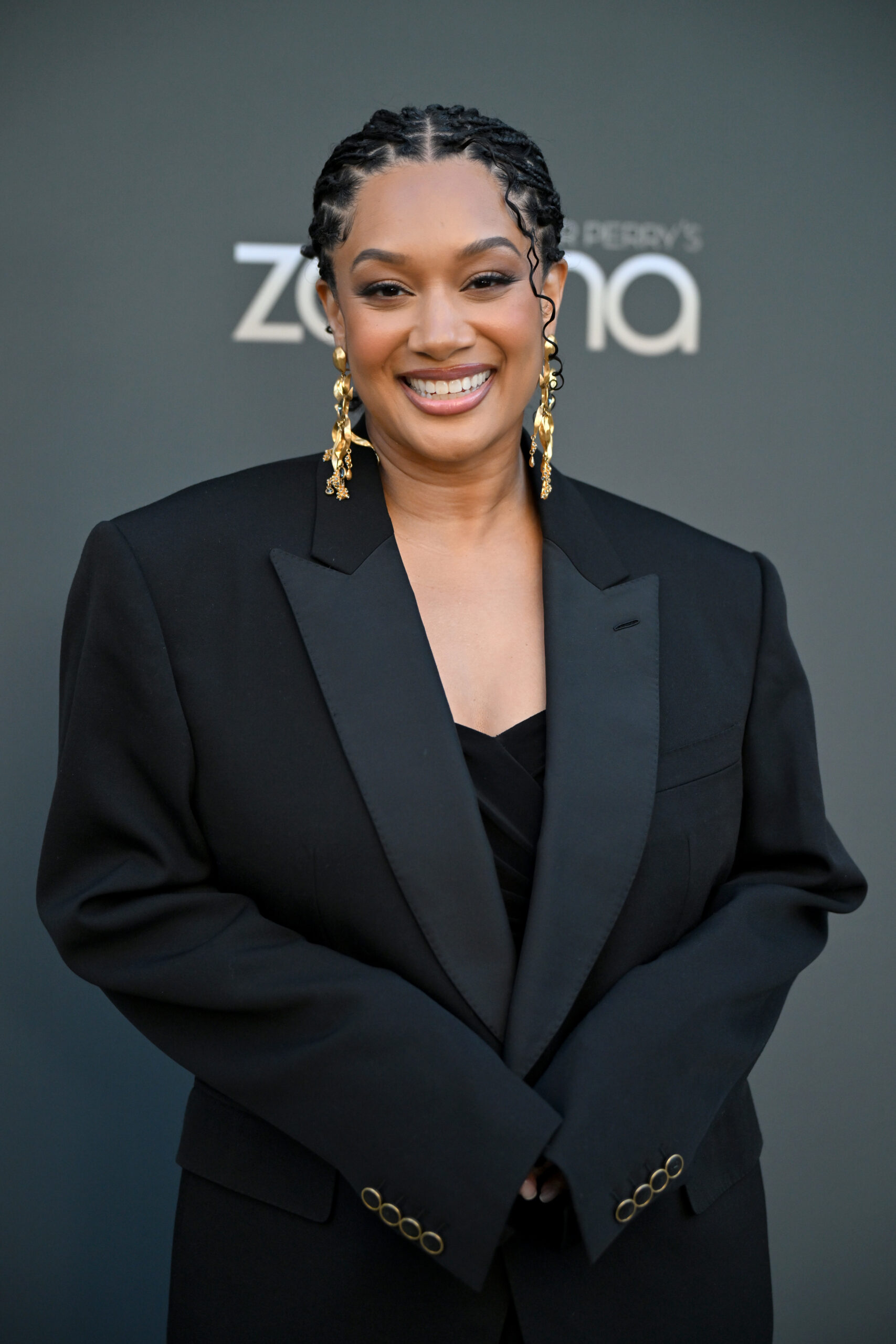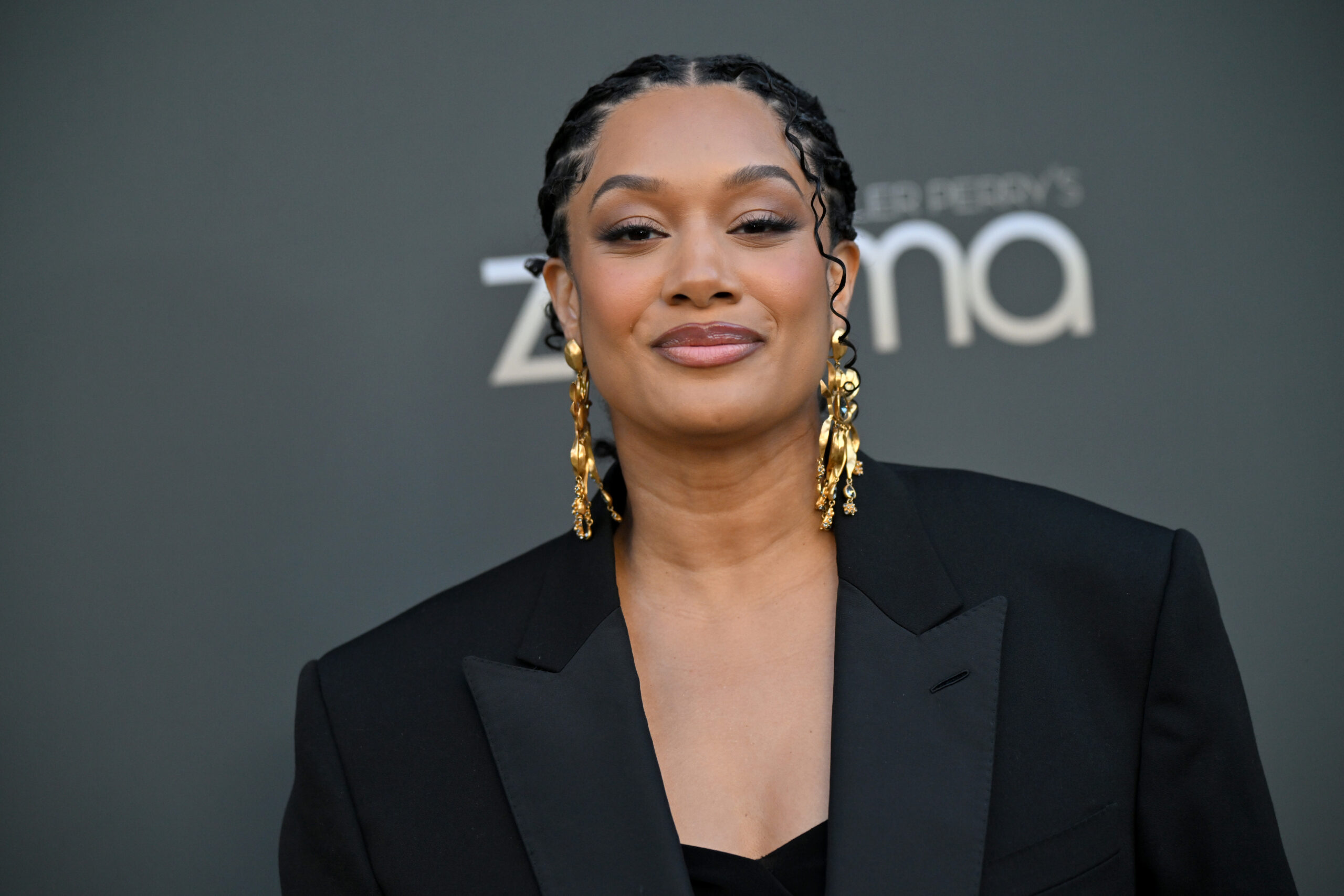 On the carpet, I asked her about Fatima’s style this season, and she shared that since her character is pregnant, the wardrobe leans into unexpected maternity looks still delivering plenty of fashion moments. For the premiere, Crystal exuded elegance in an all-black ensemble: a designer oversized blazer draped over a pleated sheer dress, finished with statement earrings and sleek stiletto heels. She noted that the oversized blazer trend is having a major moment right now.