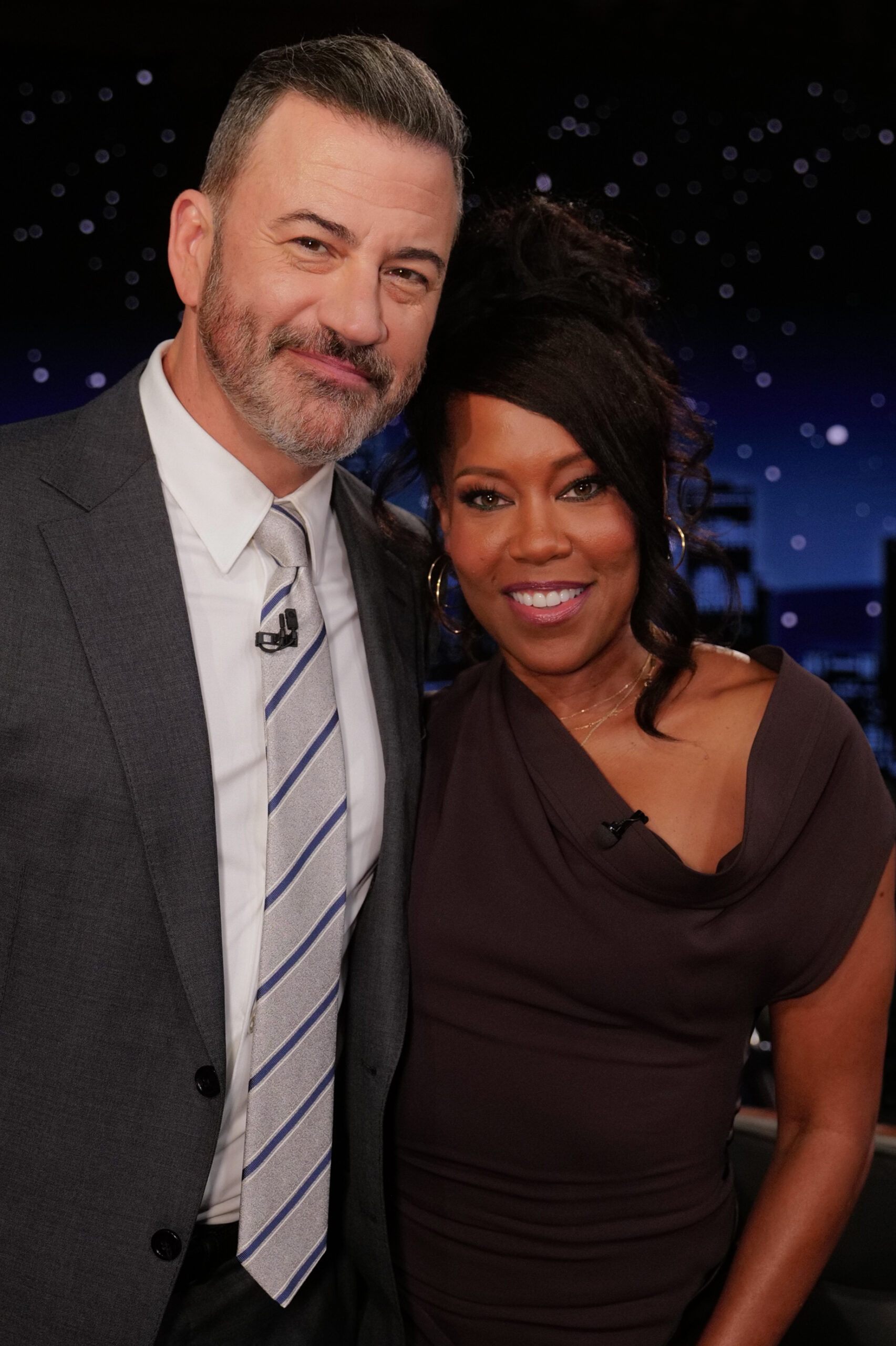 Regina Hall sat down to talk to Jimmy Kimmel about starting to act professionally when she was thirteen, being named “Most Talented” in high school, her “227” friends taking out an ad in her yearbook congratulating her, her clothing line with perfectly sized pockets for joints, finding out that Bad Bunny was in her new movie Caught Stealing, doing a New York accent, and her wine MianU dedicated to her son Ian. See more pics and video clip inside…