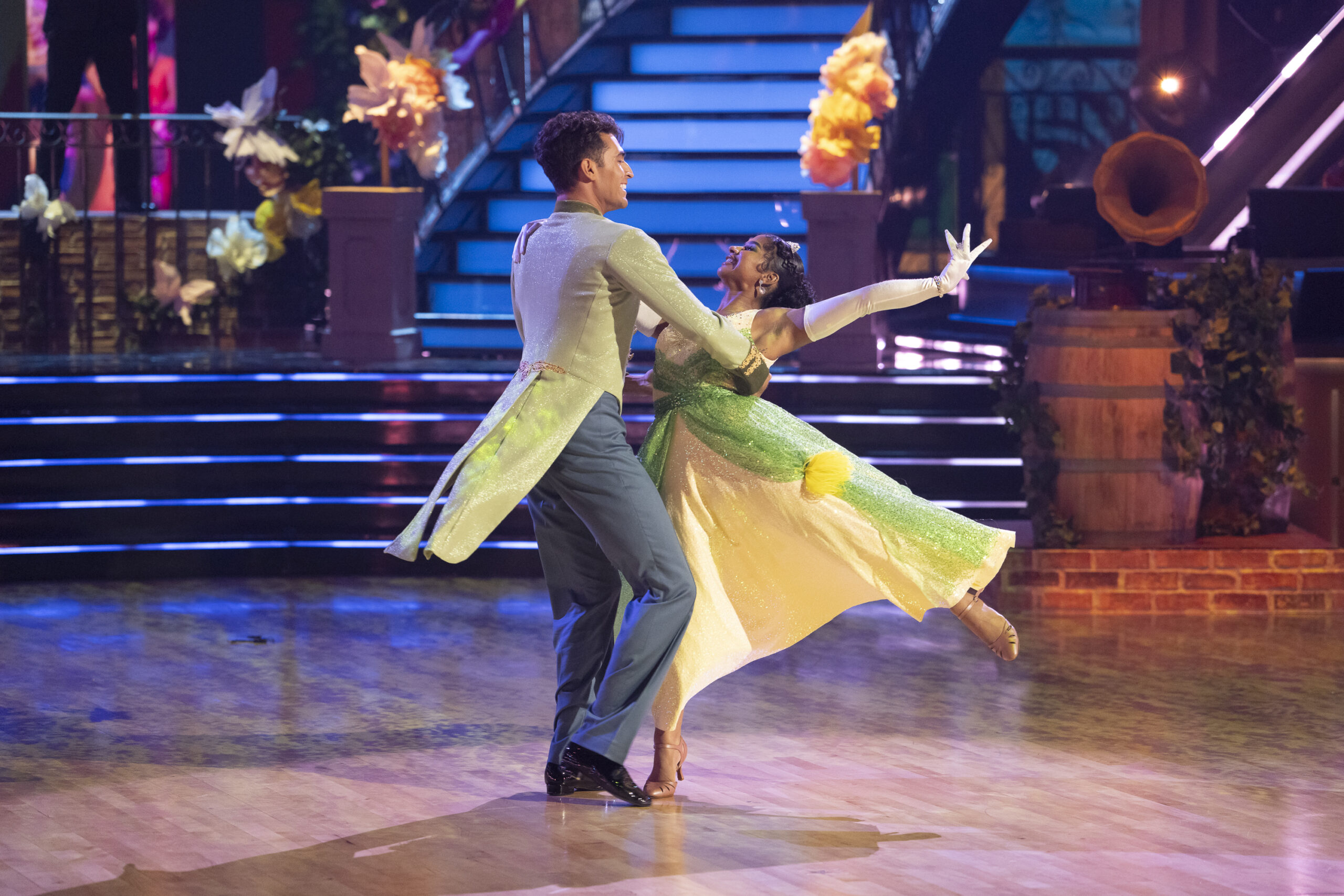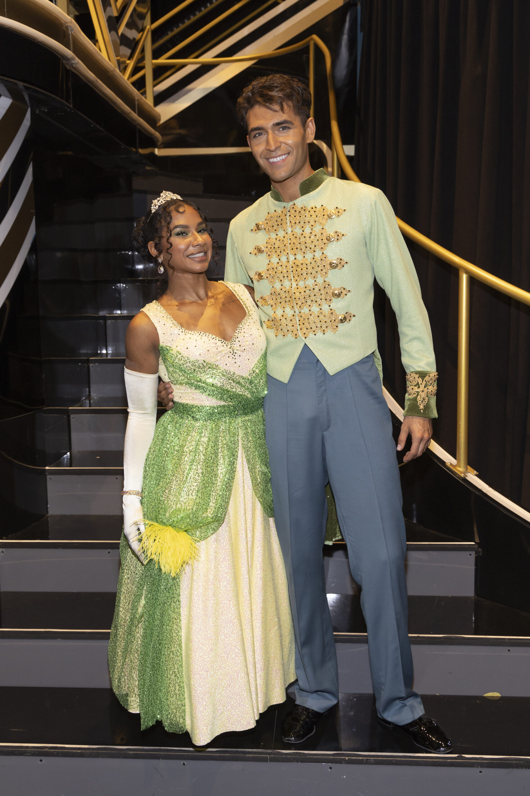 In her intro package, Jordan Chiles’ partner Ezra Sosa shared that there was no better way to celebrate their top spot on last week’s leaderboard than by dancing at Disneyland. The pair performed a lively Quickstep to “Special Spice” from Tiana’s Bayou Adventure, the new ride inspired by The Princess and the Frog.