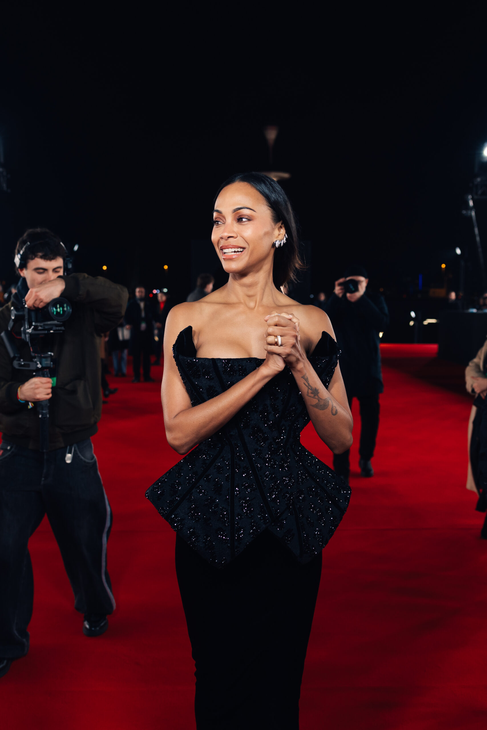 For the Paris premiere in Boulogne-Billancourt, Zoe Saldaña delivered instant wow-factor in a custom Balmain creation inspired by the house’s Pre-Fall 2025 collection. The gown featured a sculpted, jewel-studded corset that carved a stunning architectural silhouette through the bodice—balancing strength, elegance, and pure red-carpet drama. Balmain smartly streamlined the look, removing the animal print from the runway version, allowing the craftsmanship to shine. Cartier jewels added refined sparkle, with styling by Petra Flannery. See more inside…
