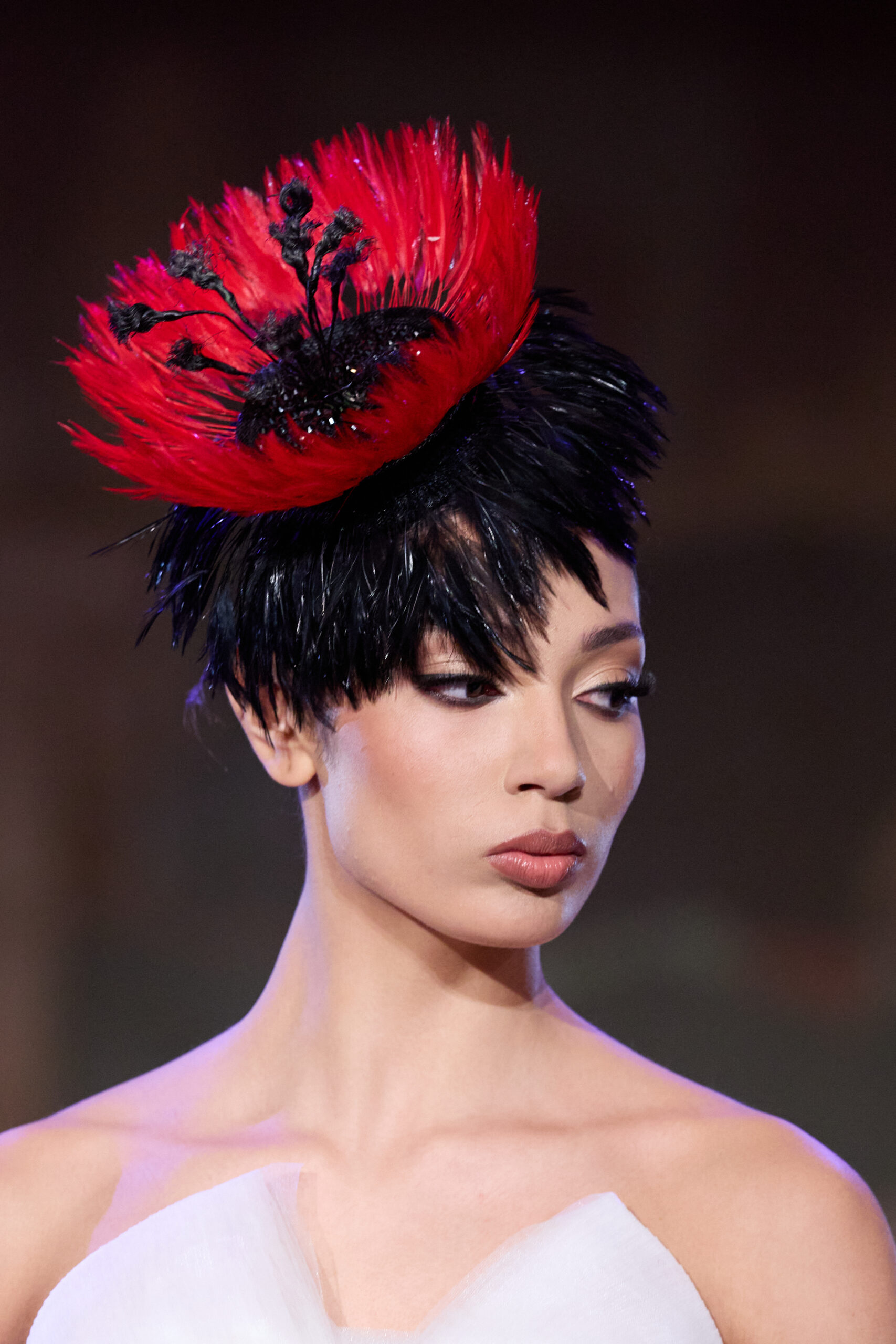 A nocturnal palette anchors the collection, including inkwell black, bone white, champagne gold, garnet and smoke silverreinforces the cinematic atmosphere, with beauty by Odilis and hair by Vivienne Mackinder leaning into polished, era inspiring glamour.